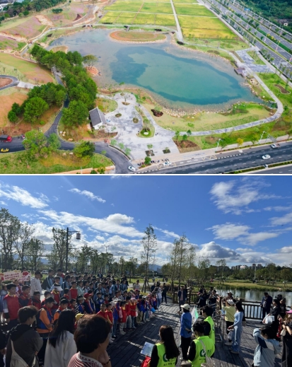 龍州濕地是九龍江流域山水林田湖草沙一體化保護和修復項目海綿城市建設范例工程,也是我市2023年十大重點攻堅項目北部新城建設的“點睛之筆”,主要使用的是國家政策補助資金。項目占地面積約20公頃,通過“護山、理水、營林、興田、清湖、豐草”六大舉措,構建了蓄洪湖區(qū)、生態(tài)修復區(qū)、農田區(qū)及休閑區(qū)多樣用地,同時,設置了蓄洪湖、濕地步道、山谷攔蓄、引水工程等海綿設施,實現“城在田中田在城中”山水田園與城市和諧共生的美好景象。