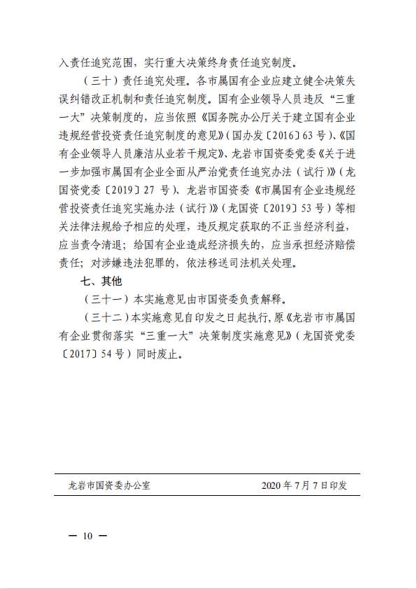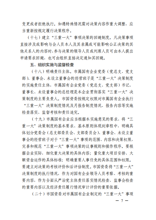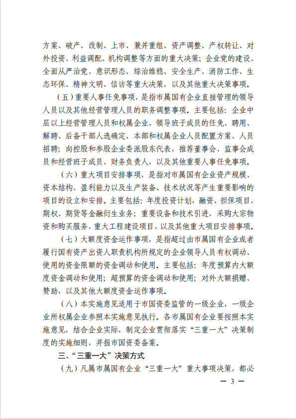 關(guān)于進(jìn)一步規(guī)范市屬?lài)?guó)有企業(yè)貫徹落實(shí)“三重一大”決策制度實(shí)施意見(jiàn)(國(guó)資黨委[2020]21號(hào))