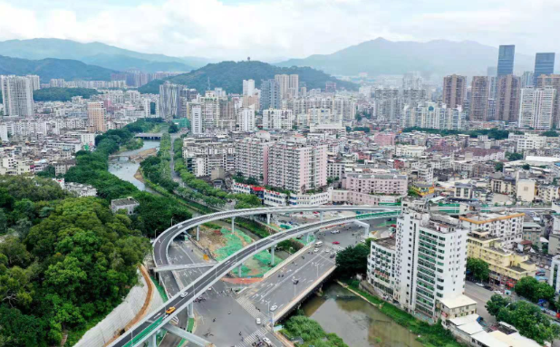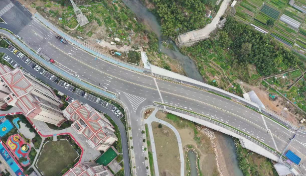 羅橋節(jié)點(diǎn)改造提升工程2019年11月開工建設(shè),2021年8月建成通車。該項(xiàng)目沿北環(huán)西路、龍興路設(shè)置南北分離式雙向四車道高架,南側(cè)接龍興路,北側(cè)接現(xiàn)狀北環(huán)西路,高架靠東側(cè)布置(緊貼烈士陵園),橋梁總長約1140米,凈寬約7.7米;在雙洋路、龍川北路、北環(huán)西路設(shè)置人行天橋,與山體步道銜接,以完善慢行系統(tǒng);在烈士陵園山體下采用明挖回填方式設(shè)置框涵,長度約225米,凈寬10.75米工程投資1.4億元。
